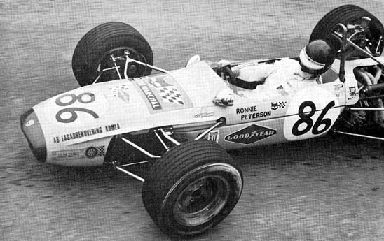 25 maj 1968 Monaco, Monte Carlo (32)Ronnie Peterson i den 32:a F3-starten i karriären. Och denna nästa tävling i utlandet för Ronnie blev på Monacos klassiska bana i ett F3-lopp som föregick huvudattraktionen - det klassiska Formel 1-loppet. Så gott som hela Formel 3-eliten hade mött upp på plats. Totalt 52 förare slogs om de 40 kvalplatserna. Snabbast under träning var den unge amerikanen Roy Pike som i sin Titan lyckades ta sig runt stadens gator på 1.36,4 - ett par tiondelar bättre än Alan Rollinson i en Chevron. Reine Wisell lyckades bästa av svenskarna och placerade sig som sjua med 1.37,5. Övriga svenskar som tog sig vidare var Uffe Svensson (tia med 1.38,2), Ronnie (13:e med 1.39,2) och Jonas Qvarnström (26:a med 1.40,2). Loppet kom att köras över två kvalheat om vardera 16 varv. Udda placeringar startade i det första heatet, vilket betydde att såväl Reine som Ronnie hamnade där. Timmen innan start hade det börjat regna, varför det blev lite halvpanik bland samtliga när det gällde att hinna leta rätt på och montera regndäck. Först på startlinjen fick Reine på sina svålor - precis lagom till start. Snabbast iväg var Jassaud, fjolårstvåan i en Matra. Därefter följde Pike och Depailler (som gjorde en kanonstart från tredje startled i en Alpine). Även Ronnie noterades för en mycket snabb start - Ronnie hade valt att behålla slicksen på och är efter det första varvet uppe på en fjärdeplats. Reine, som inte hunnit spinna in sina nya däck, låg då sjua. I chikanen satsar Pike för hårt och kvaddar sin vagn. Jassaud drar ifrån emedan Ronnie har en hård kamp om andraplatsen med Depailler. På det femte varvet lyckas Ronnie bromsa sig förbi. Precis innan målgång får Ronnie problem vid en varvning - en situation som Depailler utnyttjar till att klara andraplatsen. Reine har ett tag varit nere på niondeplats, men lyckas trots en snurrning i gasverkskurvan klara en åttonde placering . Även det andra heatet bjuder på en våt bana. Uffe Svensson är fyra efter det första varvet, endast Mike Beckwith, Alan Rollinson och François Cevert är före. Cevert faller bakåt samtidigt som Jonas Qvarnström arbetar sig uppåt i fältet. Då Uffes ena stift lägger av vinkar han förbi Jonas, men svenskarna klarar ändock tredje och fjärdeplatsen. Fyra svenskar till final således - imponerande! Startuppställningen i finalen baserades på tiderna i respektive heat. Detta kom att göra att de flesta från det första heatet (som körde under något bättre förhållanden) placerades före förarna från det andra heatet. Ronnie stod därmed i andra led tillsammans med Jassaud och Depailler. Reine återfanns i fjärde startled. Övriga svenskar långt ner (vilket även gällde för de segrande DAF:arna från andra heatet). Totalt skall 24 varv köras vilket gör drygt 7,5 mil då banan runt stadens gator mäter 3.145 m. Återigen gör Jassaud en fantomstart och efter en runda är Depailler tvåa med Ronnie i bakhasorna. Fyra var då fransmannen Vigoreux i en Martini-vagn. Därefter Charlie Lucas, Peter Westbury och Reine Wisell. På det andra varvet lyckas Ronnie passera Depailler och Lucas bryter med en kass motor. Även Reine avancerar två placeringar. Uffe Svensson har otur och kör in i en snurrande bil - en halvminut i depå gör att han kommer ut på sista plats. Då även Reine försöker ta sig förbi Depailler kolliderar de båda så illa att Reine omedelbart tvingas kasta in handduken och Patrick ett par långsamma varv senare. Jassaud och Ronnie i toppen kände sig i detta läge relativt ohotade. Åtminstone Ronnie slog av på farten för tidigt - bakom honom hade en hård fight utvecklats mellan Westbury, Cevert och Peter Gethin. Mot slutet av loppet sätter Gethin in en spurt och det är av en slump som Ronnie uppmärksammar hotet i sina backspeglar - inga depåsignaler har nämligen skickats. Sex varv före mål är engelsmannen ikapp och Ronnie tvingas släppa förbi honom. Ledande Jassaud får mot slutet av loppet problem med motorn, den går bara på tre cylindrar, men han lyckas hålla undan för Gethin och Ronnie och vinner loppet - precis som han lovat innan start! Loppet blir Ronnie Petersons hittills bästa framträdande i F3. Han slutar som trea i finalen efter att länge innehaft andraplatsen. Jaussaud har snabbaste varv med 1.36,4 (117,450 km/h).