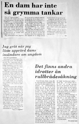 Jag kan förresten berätta att dessa "skateboardkoner" från 70-talets tävlingar på Frösö Camping nu åter kommer till sin rätt, men idag nere i Täby och med brädor från ett helt annat sekel! Med tiden växte sig sporten riktigt stor i Östersund. Specialaffärer startades upp (som t ex Lejon-butiken), men de gick snart i konkurs. De hemmabyggda ramperna ersattes snart av kommunala satsningar som höll riktigt god kvalitet, men lika snabbt som intresset väckts – lika snabbt dog det ut! Nu var det plötsligt windsurfing som gällde, men det är ju en helt annan historia… Nedtecknad av Rickard O. Lindström. |