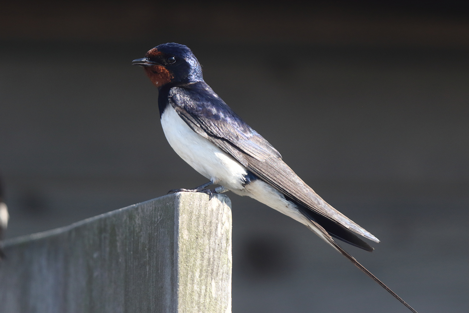 En adult hane av den europeiska nominatformen H. r. rustica är 17–19 centimeter lång inklusive 2–7 centimeter långa yttre stjärtpennor. Den har ett vingspann på 32–34,5 centimeter och väger 16–22 gram. Den har skimrande stålblå ovansida och rödbrun panna, haka och strupe, som avskiljs från de smutsvita underdelarna av ett brett mörkblått bröstband. Den känns igen på att de yttre stjärtpennorna är mycket långa, vilket gör stjärten mycket djupt kluven. Ving- och stjärtpennorna är svarta, de båda mellersta stjärtpennorna enfärgade, de övriga med en vit fläck i inre fanet.