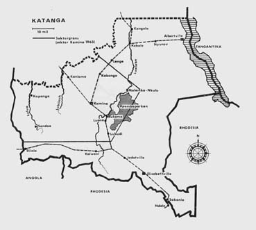 Sjuttio år senare ger dr David Livingstone följande uppgift: "Genom att smälta malakit, en kopparmalm, erhåller de infödda i Katanga stora tackor, som de utformar som ett stort I eller ett kors." Kopparkorsen har sedan gammalt varit symbolen för ett permanent värde. De framställdes av de olika stammarna inom Katanga i många varierande former och storlekar och användes inom stora delar av Central- och Östafrika som bytesvara och köpmynt. Tidigare betalades brudpris med kopparkors i Katanga, en sed som undantagsvis förekommer ännu i dag. För en hustru erlades t ex småboskap, höns, salt, tyg samt ett försvarligt antal kalebasser med hirsöl eller palmvin. Som den viktigaste och värdefullaste tributen lades sedan ett till tre kopparkors. I provinsen Katangas flagga, som har ett rött och ett vitt fält skilda åt genom ett grönt, diagonalt band, pryddes det vita fältet av tre katangakors. Storhövdingen och ledaren för Baluba-Shankadi-dynastien, Kasongo Niembo i Kaminaville, förklarade symboliken hos flaggan på följande sätt: "Det röda fältet är blodet kärleken till fosterjorden, det vita fältet betecknar upplysningen och de kulturella framstegen, det gröna, diagonala bandet symboliserar modernäringen, åkerbruket och boskapsskötsel. De tre kopparkorsen är signum för landets kopparrikedom, men också för det urgamla, fäderneärvda bruket att betala tre kors för en hustru." Befolkningen i Katanga är ingalunda homogen, fastän alla går under benämningen katangeser. Sålunda är också språken många och skiftande. Swahili är den gemensamma nämnaren då det är fråga om de kulturella, politiska och ekonomiska sambanden stammarna emellan. Annars har varje stam sitt särskilda stamspråk, som har ytterst lite gemensamt med swahili - det sistnämnda är ju importerat österifrån genom araberna. Kongo-swahilin skiljer sig dock väsentligt från den swahili som talas i Kenya och Tanganyika. På samma sätt är också skillnaden avsevärd mellan stamspråken. Här nämns några få av de mest betydande stammarna inom Katanga - stammar som antingen är bosatta inom ett rent stamområde med en betydande befolkning, eller också vandrar genom landet som små minoriteter avlägset från sina egentliga stamområden: tshiokwe, luba, lubakasai, tetela, yeke, songe, lunda, kete, kuba, kanioka, ndembo. Det skulle föra oss för långt att beskriva alla. Låt oss se på de under katangaoroligheterna mest omtalade och omskrivna stammarna, vilka prominenta politiker som Tshombe, Munongo, Sendwe, Lumumba och Kalondji tillhör eller tillhört. Lundastammen är nuvarande premiärminister Moïse Tshombes egen stam. Centrum för Lunda är området på båda sidor om axeln Sandoa-Kapanga. I Kapanga har den store lundahövdingen Mwata Yamvo Detende Yawa Nawezi IV sitt residens. Denne negerpotentat härskar oinskränkt genom en mångfald underhövdingar, som de allra flesta är befryndade med hans familj, över stora områden i Syd-Katanga, Nord-Rhodesia och Angola. Den förre Mwata Yamvo, som dog i juni 1963, var svärfar till Tshombe. Moïse Tshombe, son till en framgångsrik affärsman i Sandoa, äktade den betydande lundahövdingens dotter, och gifte sig till politiskt inflytande. Lundastammens politiska makt ökades väsentligt då den allierade sig med yeke, med stamorten Bunkeya ej långt från Jadotville-Kolwezi. Yekestammen, dit Katangas f d inrikesminister Munongo hör, är spillrorna av den legendariske negertyrannen M'siris imperium. Kungen M'siri dödades av de första belgarna som trängde in i Bunkeya-området. Munongo själv är sonson till M'siri - kanske detta kan vara förklaringen till hans starka ovilja mot européer i allmänhet och belgare i synnerhet. Lunda och Yeke kom att bilda stommen i det politiska partiet Conacat, vilket förde de nämnda herrarna till makten. Man överflyglade t o m lubastammens politiska parti, Balubakat, vars ledare var Sendwe Jason. Härmed lämnar vi det politiska intrigspelet - bakgrunden till Kongokrisen - för att se något på seder och bruk, typiska för stamfolken. Den livliga kontakten mellan stamgrupperna, dominansen av de stora stammarna, flyttningarna inom olika områden särskilt livliga har tshiokwe och kuba varit - har medfört ett starkt ingifte. Den blodsblandning detta inneburit, har påverkat det andliga-kulturella området i vad rör seder och språk, riter, ceremonier och konst. Balubastammen har i stor utsträckning idoler, populärt men något felaktigt benämnda avgudar. Invigningen av idolerna skedde genom fetischprästens försorg. Hustrun avbildades med nakna bröst och med tatueringarna väl synliga. Dessa trä- eller elfenbensstatyetter behängdes sedan av mannen med pärlband, smycken, mynt, tygremsor, koppartråd, mässingsklockor o d; muntu wa bene - bröstmänniskan - skulle symbolisera hustruns fruktbarhet och snara nedkomst med barn åt mannen. Ett annat samband med de religiösa aktiviteter, som ngangan - fetischprästen - utövar, har jakten. Jaktvapnen invigs och förses med jaktamuletter, s k nkisi. Pilgiftet hämtas av ngangan från giftträdet, och före jakten leder han ibland speciella votiv-danser, som avser att bringa jaktlycka. Dessa danser har hos vissa stammar en rikt utformad koreografi medan de hos andra är av ringa betydelse. Ngangans viktigaste attribut är viskan av buffel- eller gnusvans, mukila, vilket helt enkelt betyder svans. Dess handtag är mestadels konstnärligt utformat med bilder och snidningar. Mukila är ett kombinerat besvärjelseredskap och flugviska, men också liksom ceremoniyxan ett rätt allmänt hövdingesignum. Det primära mänskliga behovet - maten - är hos bantu, Kongos övervägande folkslag, baserat på vegetabilisk kost. Inte av princip, ty man älskar kött och fisk, men för att dessa senare produkter ej finns i tillräcklig omfattning. På matsedeln förekommer maniok, sötpotatis, jordnötter, majs, linsbönor, bananer och olika slag av kå