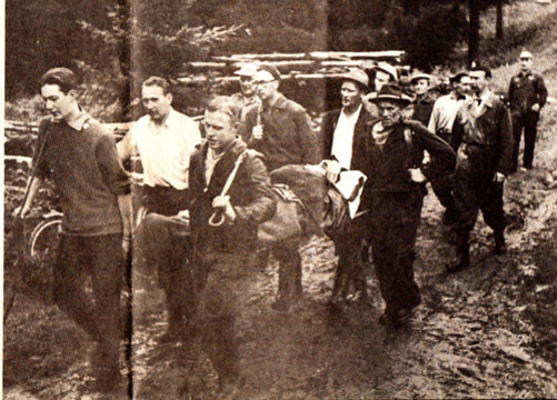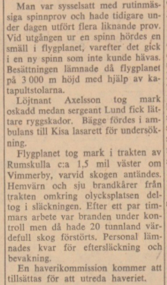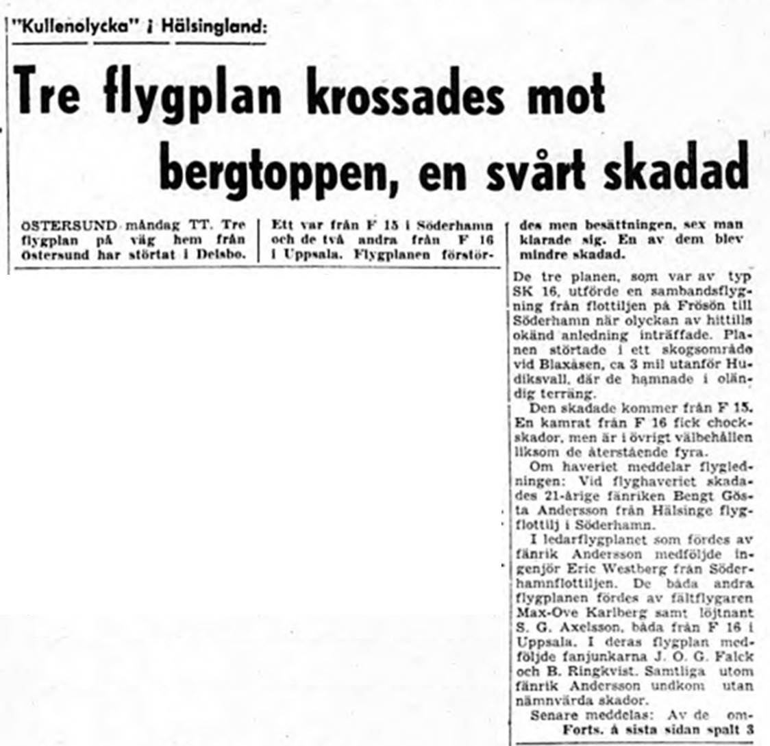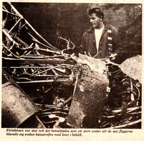 Flygkraschen hördes milsvitt omkring. De tre flygplanen hade plöjt breda gator genom tallskogen och fått sina vingar avskalade från flygplanskropparna. Trots den oländiga terrängen lyckades hjälp ta sig relativt snabbt till katastrofplatsen. Alla sex besättningsmän hade som genom ett mirakel överlevt kraschen. Max-Ove Karlberg, vars flygplan hade hamnat upp och ner, fick skäras loss ur sin sele. Medpassageraren Börje Ringkvist blev endast lätt skadad. Värre gick det för Bengt Gösta Andersson, vars stol slets loss så att han hade kastats framåt med våldsam kraft. Han hade formligen blivit skalperad och forslades i ambulans till Hudiksvalls sjukhus – detta efter att ha burits 3-4 km ner till närmaste bilväg vid Svartvallen. Vid ankomst var han medvetslös och underkastades omedelbar operation. Eric Westberg, som hade medföljt i samma flygplan, hade däremot klarat sig nästan helskinnad. Nedanstående foton ur Hälsinge Tidning.