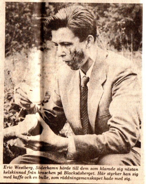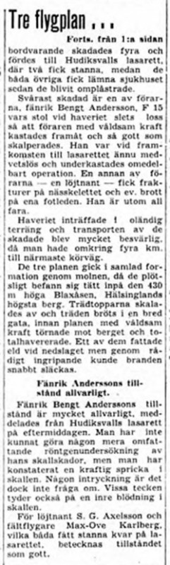 Sten Axelsson hade fått ett ordentligt jack i hakan och stukat foten. Efter att ha blivit omplåstrad på lasarettet lät han undslippa för Hudiksvalls Tidning: ”Man flyger inte ostraffad mot en bergvägg. Vi strök över skogstopparna och jag hann se ett par granar (!) knäckas som stickor. Sedan slog alla tre planen i nästan samtidigt.” Sten har senare berättat för en av sin kursare i Flygvapnet (Kurt Ivarsson) om hur han haltande tog sig fram genom storskogen till en gård, varifrån han kunde ringa flottiljen (F 15) och anmäla haveriet. Blackåsberget (eller ”Blaxåsen”) finns avbildad på en tavla som sitter uppsatts på Gästrike-Hälsinge nation i Uppsala. Trolig konstnär är John Sten. På tavlan framgår tydligt hur berget verkligen sticker upp.