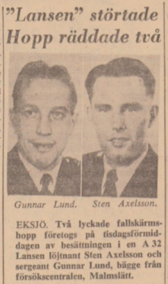 Nils Benker minns när Sten kom till F 16 ”full av idéer”: ”Han hade börjat fundera på taktiken med en s k ”borr” för att lura med sig Mig 15 ner på låg höjd under hög belastning, därigenom försvårande för angriparen att komma till skott och därvid också få ett psykologiskt övertag och bättre manöverförmåga på den låga höjden långt från angriparens hemmabas. Hans flygstyrkechef Claes Jernow var med på noterna, hela flygstyrkan förfinade taktiken, och med jämförande diagram, signerade Sten, tog Jernow honom med sig till Kalle Kula som blev eld och lågor. Stora hemligstämpeln togs fram och Sten sändes till Försökscentralen på Malmslätt. Innan han senare demonstrerade Draken för oss på F 16 (jag råkade vara inkallad då) hade han tvingats hoppa ur en Lansen och berättade glatt hur han utforskade sin egen flygförmåga genom kullerbyttor och annat innan han utlöste skärmen.” Sten hade med andra ord bytt sin hemvist från F 16 i Uppsala till Försökscentralen (FC) på Malmslätt i Linköping då han den 23 juni 1959 tillsammans med en kollega tvingades skjuta ut sig ur en A32A ”Lansen”. Flygplanet var lånat av FC från F 14 i Halmstad. Efter urgång ur spinn under spinnprov hördes en smäll i flygplanet, varefter det gick in i en ny spinn som piloten inte kunde häva. Besättningen lämnade då flygplanet med hjälp av katapultstolarna. Flygföraren (lt Sten G Axelsson) och säkff (sg Gunnar S Lund) räddade sig med fallskärm från 3.000 m höjd. Sten kunde ta mark oskadd medan Gunnar fick lättare ryggskador. Bägge fördes till Kisa lasarett för undersökning. Händelsen inträffade vid Svinshult, 40 km NO Eksjö. Flygplanet tog mark i trakten av Rumskulla c:a 1,5 mil väster om Vimmerby. Tyvärr antändes skogen vid nedslagsplatsen och Hemvärn tillsammans med sju brandkårer fick kämpa i ett par timmar innan branden var under kontroll, men då hade 20 tunnland värdefull skog redan förstörts.