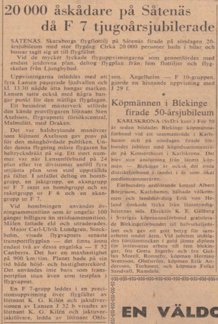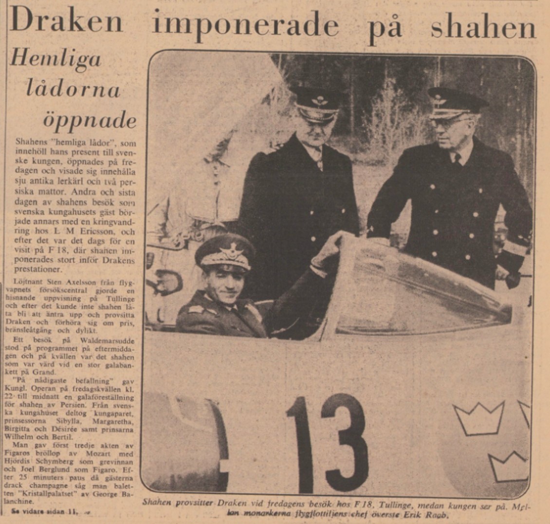 Sten var också den som stod för en hisnande flyguppvisning med ”Draken” vid F 18 i Tullinge i samband med shahen av Irans besök i Sverige i maj 1960 och även den som berättade mer om flygplanet och dess egenskaper i samband med att monarken provsatt J 35:an.