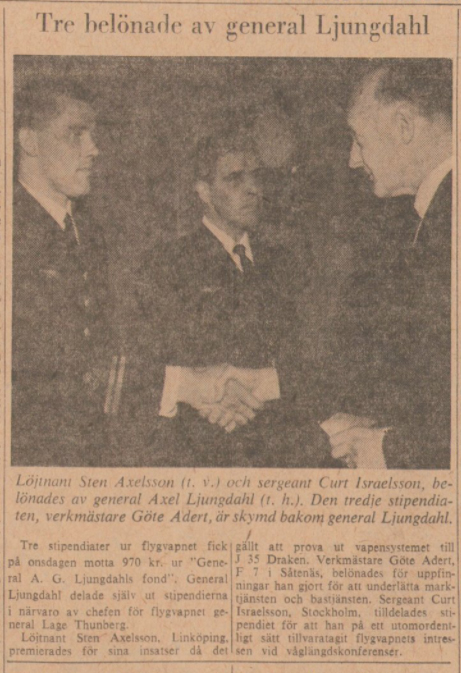 Under sin tid vid FC blev Sten inte bara uppmärksammad som den otroligt duktige uppvisningspiloten – han premierades även för sina insatser då det gällt att prova ut vapensystemet till J 35 ”Draken”. Han belönades i maj 1962 med ett stipendium ur ”General A. G. Ljungdahls fond”.