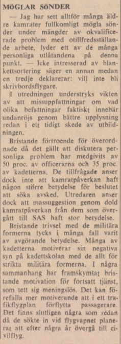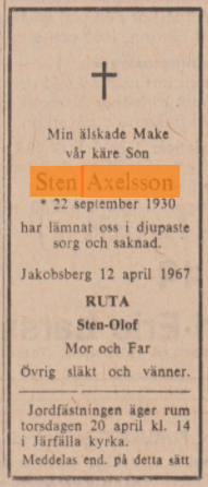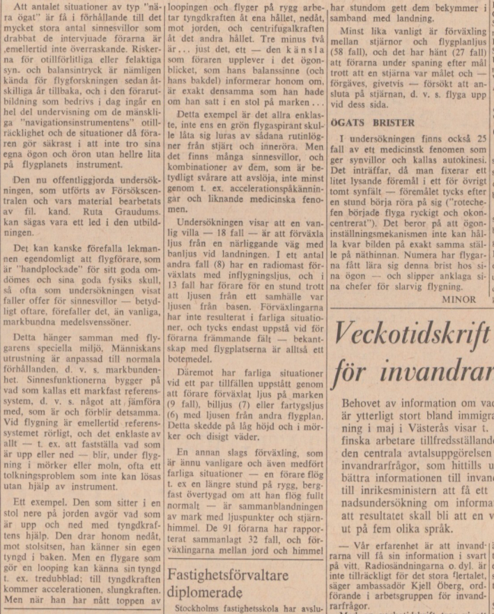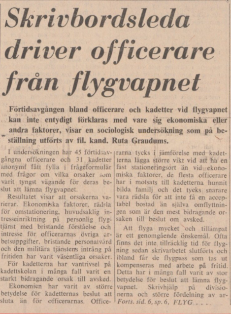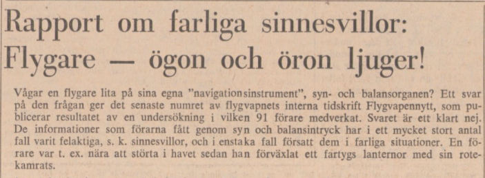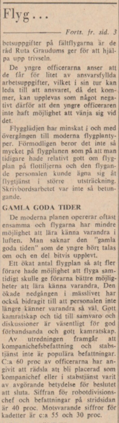 Rapporten handlar om piloter vågar lita på sina egna ”navigationsinstrument” – syn- och balansorgan? Resultatet från en undersökning där 91 flygförare medverkat gav svaret – ett klart nej! Om detta stod att läsa inte bara i flygvapnets interna tidskrift Flygvapennytt, utan även i SvD de 2 juli 1966. Ett par veckor senare kunde tidningen även berätta om en annan undersökning som beställts av fil.kand. Ruta Graudums – att förtidsavgången bland officerare och kadetter vid Flygvapnet inte entydigt kan förklaras med vare sig ekonomiska eller andra faktorer. Istället är t ex skrivsbordsleda något som driver officerare bort från Flygvapnet. Så devisen ”att flyga är att leva” har nog väldigt mycket mer att göra med sanningen än vad gemene man kanske tror… Med denna insikt är det desto mer tragiskt att tänka sig in i hur Sten kände sig då han i mitten av 1960-talet drabbades av den svåra blodsjukdomen leukemi. Sten var vid denna tid med ett par gånger i TV och av nära vänner uttrycktes det hur sorgligt och grymt det var att se den tidigare så vältränade Sten uppsvälld av cortison. Men mitt i all bedrövelse finns ändå glädjeämnen. Den 19 juli 1966 gifter sig Sten med Ruta och innan året är slut har en liten ”Olle” kommit till världen.