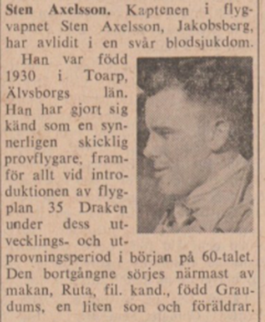 Tyvärr går inte sjukdomen att besegra och i april 1967 går Sten bort. Sven-Olof Olin (då chef för Systeminspektionen vid Flygstaben och sedermera utnämnd generalmajor och generaldirektör för Flygtekniska försöksanstalten) skrev om ”Sten Axelsson in memoriam” med ord som på ett fint sätt sammanfattar Stens flygarliv: ”En av de provflygare som presenterade och introducerade flygplan 35 Draken var Sten Axelsson. Hela hans livsintresse var ägnat åt flygvapnet. Hans målsättning var ett effektivt flygvapen med flygplan som var effektiva och säkra i pilotens hand. Hans arbetskapacitet var enorm. Det existerade inte någon gräns mellan tjänste- och fritid och för det mesta lyste nattlampan utom för några få timmars avbrott för sömn. Han var – förutom av den rena flygtjänsten – även synnerligen operativt intresserad. Hans taktiska analyser och idéer har till stora delar påverkat utformningen av vapensystemen. Han hade också en enastående förmåga att snabbt fatta de tekniska sammanhangen, vilket många gånger överraskat mer än en fackman inom skilda områden. Hans arbetskapacitet gav resultat genom att han hade en god förmåga att framföra sina åsikter och var en briljant stilist. När ovanstående egenskaper paras med framsynthet, intelligens och ett okonventionellt angripande av problem, måste resultatet bli gott. Visst gjorde hans dynamiska arbetssätt att initiativ och idéer ibland inte alltid var tillämpliga ur praktisk synpunkt. Kvar står dock de bärande idéer som kommit fram och som klart visat vägen för jaktförsvarets inriktning och praktiska användning. I det operativa analysarbetet hade han ännu mycket att ge. Som pilot var han ”out-standing” och hand utvecklade en förmåga att utnyttja flygplanet till dess yttersta gräns. Som officer var han en hängiven idealist som vigt sitt liv åt flygvapnet och som person en generös och godhjärtad människa som älskade människorna. När sjukdomen drabbade honom visade han samma obrutna viljekraft som tidigare och lät sig icke nedslås. Oavsett den ibland mycket svåra behandlingen var han fortfarande fullt aktiv. Vi tackar honom för hans hängivna livsverk i flygvapnets tjänst.”